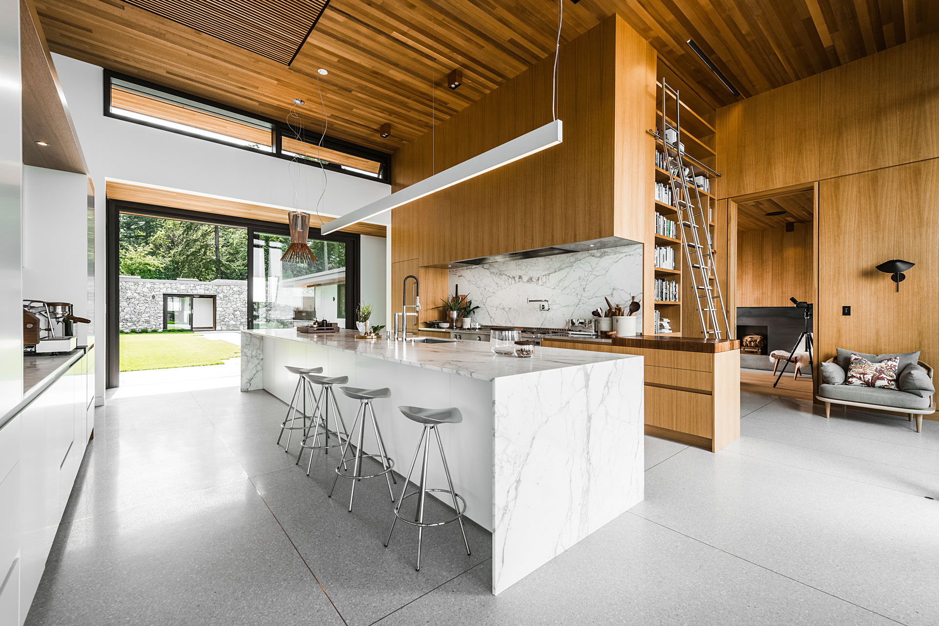 The combination of white-oak-veneered wall paneling and cabinetry, and stunning Calcutta white marble, give this kitchen an ultra-contemporary look. Floor-to-ceiling windows feature the ocean view and lead the eye toward the vertical-grain cedar ceilings. Beyond its visual aesthetics, this kitchen is the epitome of form and function. A spacious kitchen island centers a working triangle with gas range, a hidden fridge and custom-made kitchen sinks with side storage that flips down. A separate beverage centre keeps traffic away from the working space and holds a TV behind a sliding door for in-kitchen entertainment.
